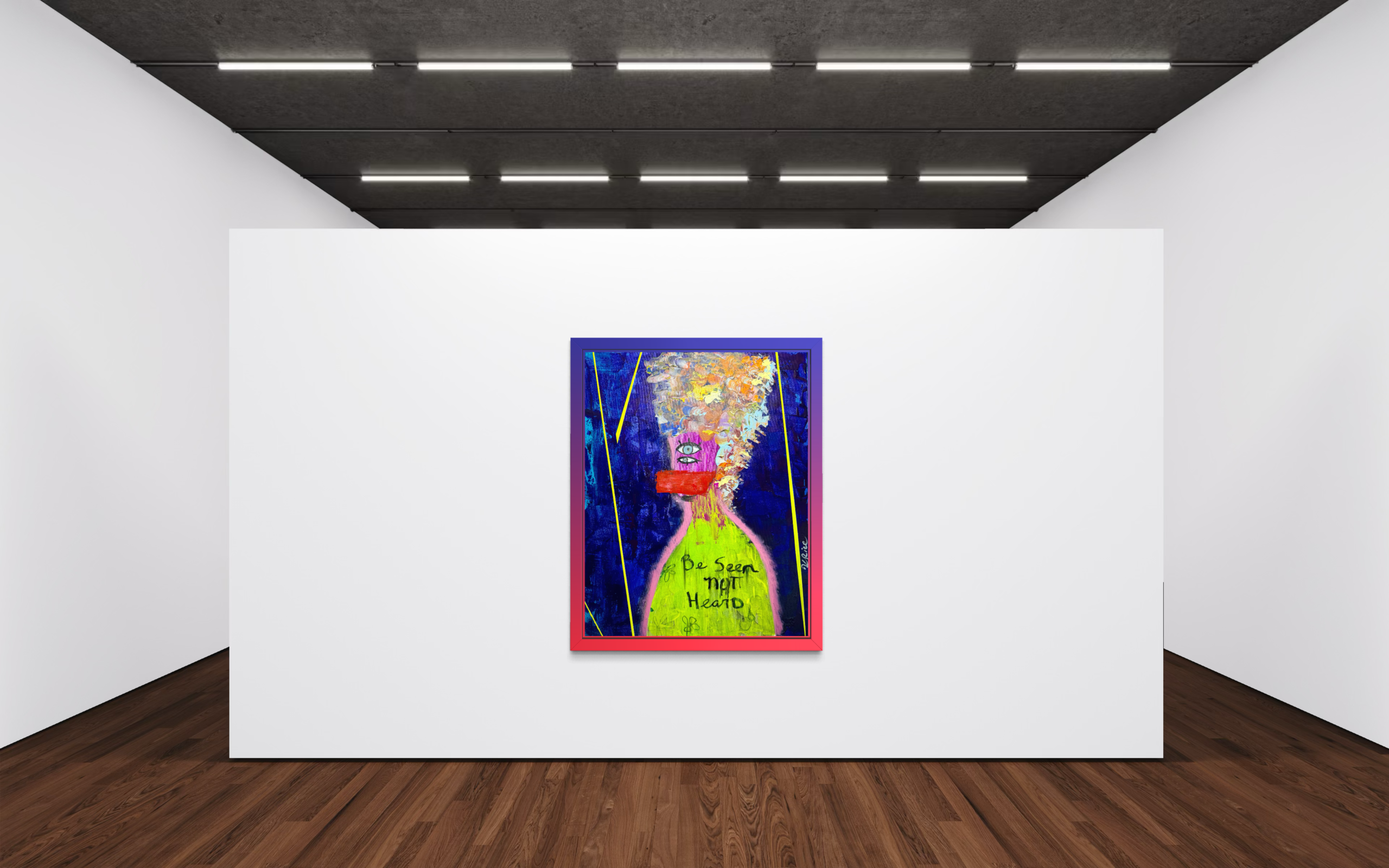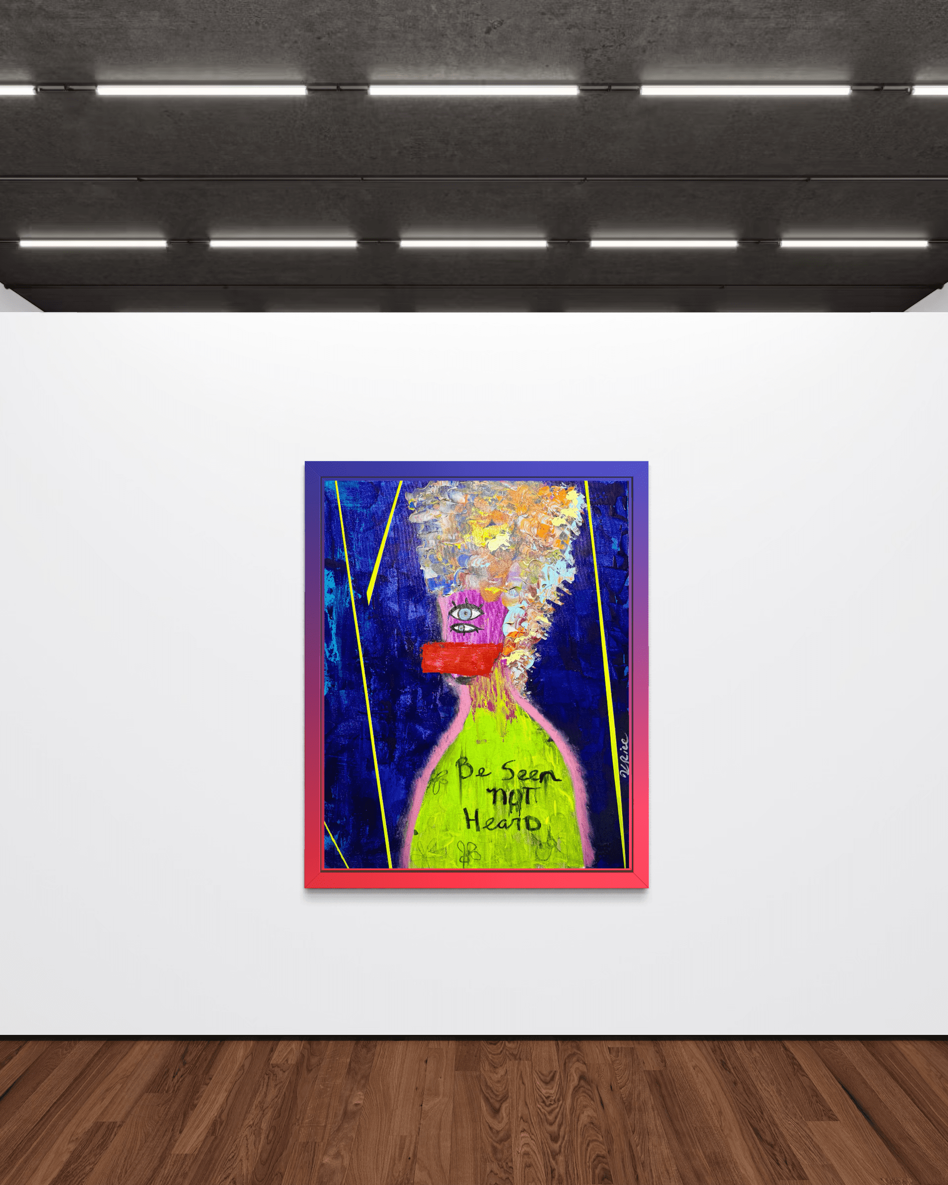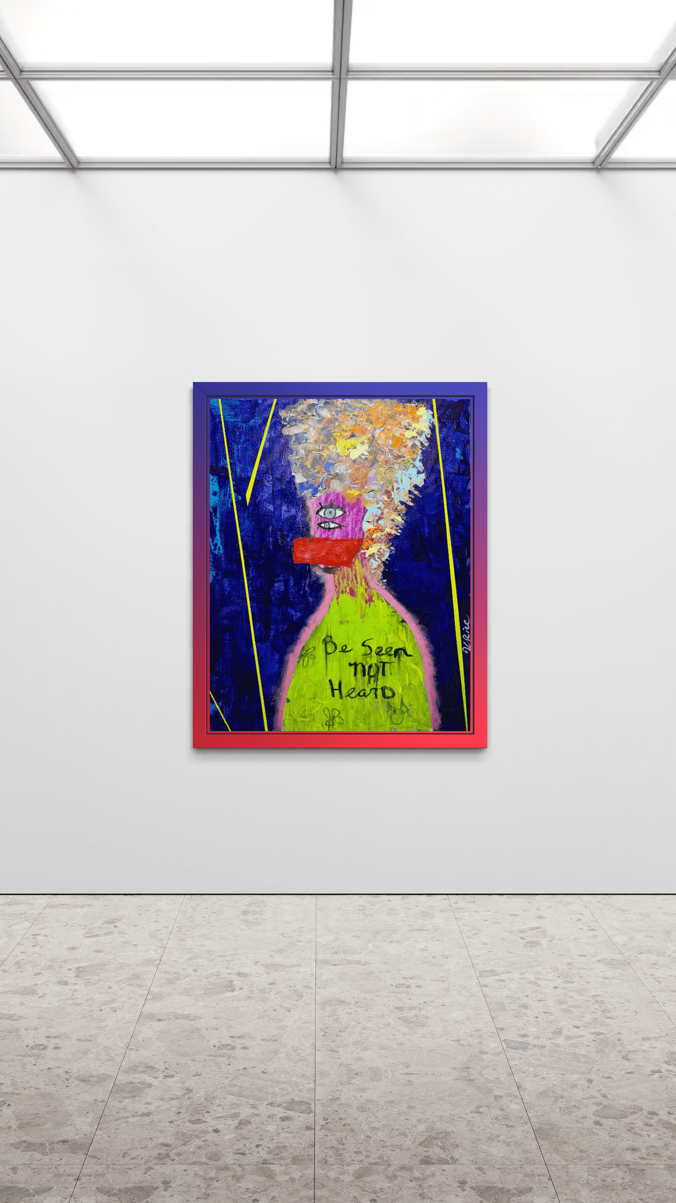 This striking piece challenges the outdated narrative that beauty must come with silence. Featuring a vibrant woman, with expressive hair, wide eyes (symbolic of intuition and the third eye) and a powerful presence. Her mouth is covered in red paint 4 a symbolic silencing. Though radiant and intuitive, she9s been told to dim her light and keep her thoughts to herself. Be Seen, Not Heard is a bold declaration of reclaiming voice, value, and visibility. It honors those breaking free from silent spaces and stepping into full expression.