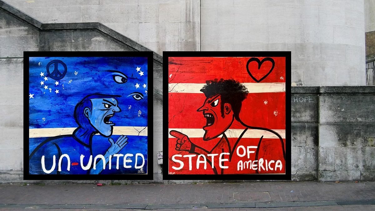 Divided We Fall is a visceral, emotionally charged diptych that speaks to the fractured state of America9s social and political landscape. Across two canvases 4 one in bold blue, the other in deep red. When viewed together, they deliver a raw, sobering truth: a country splintered from within.