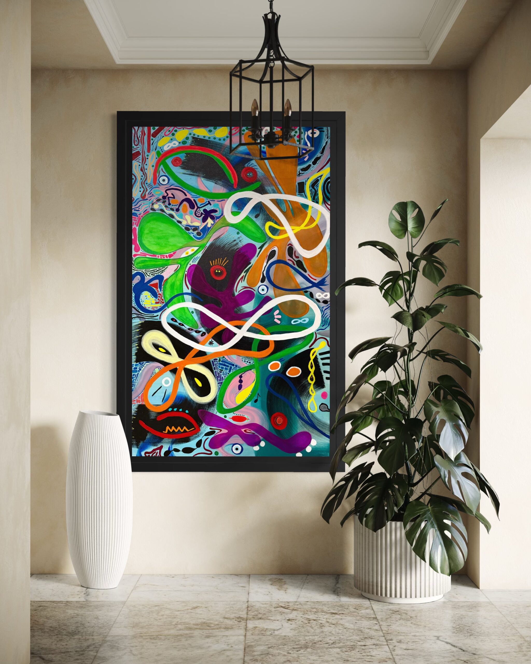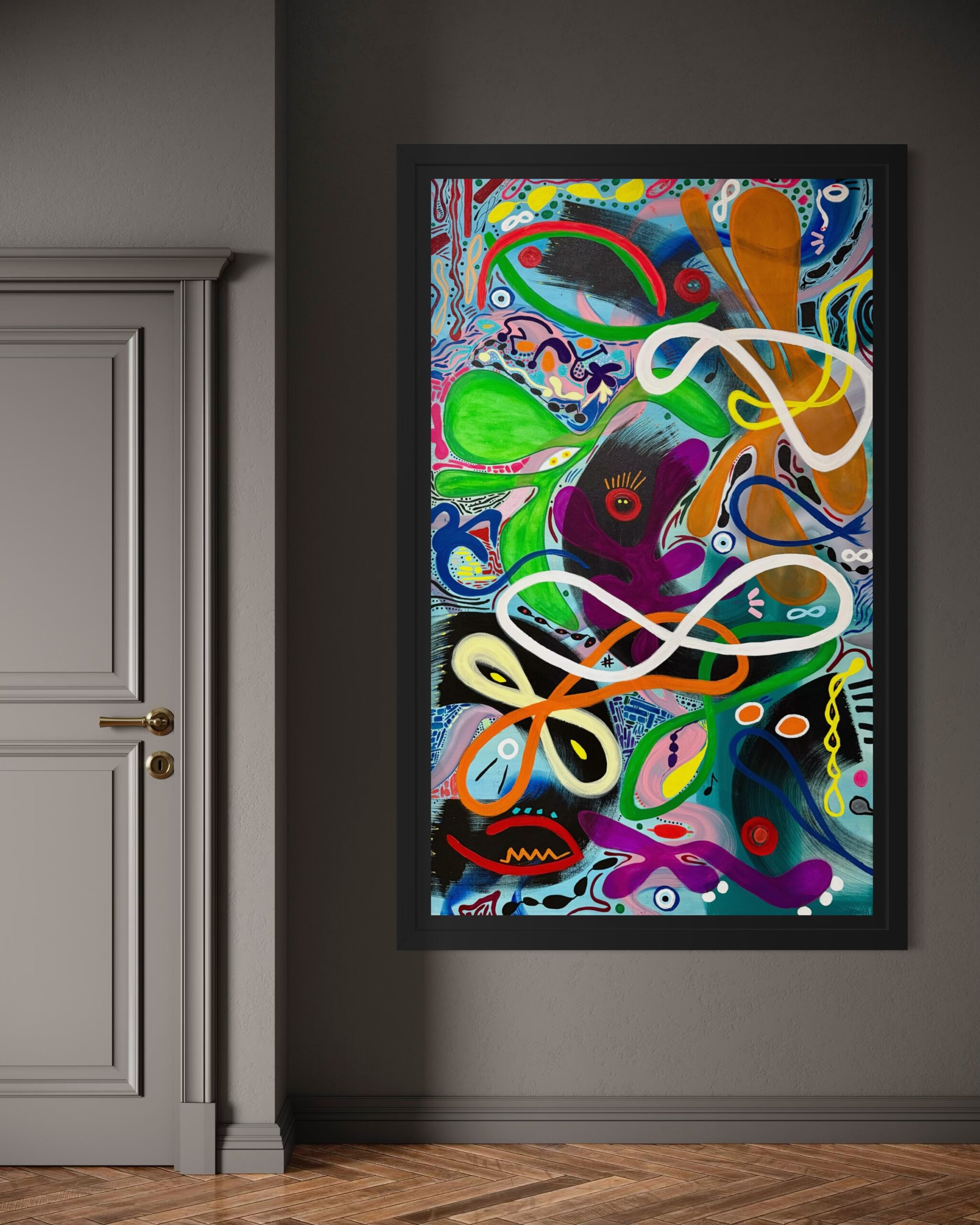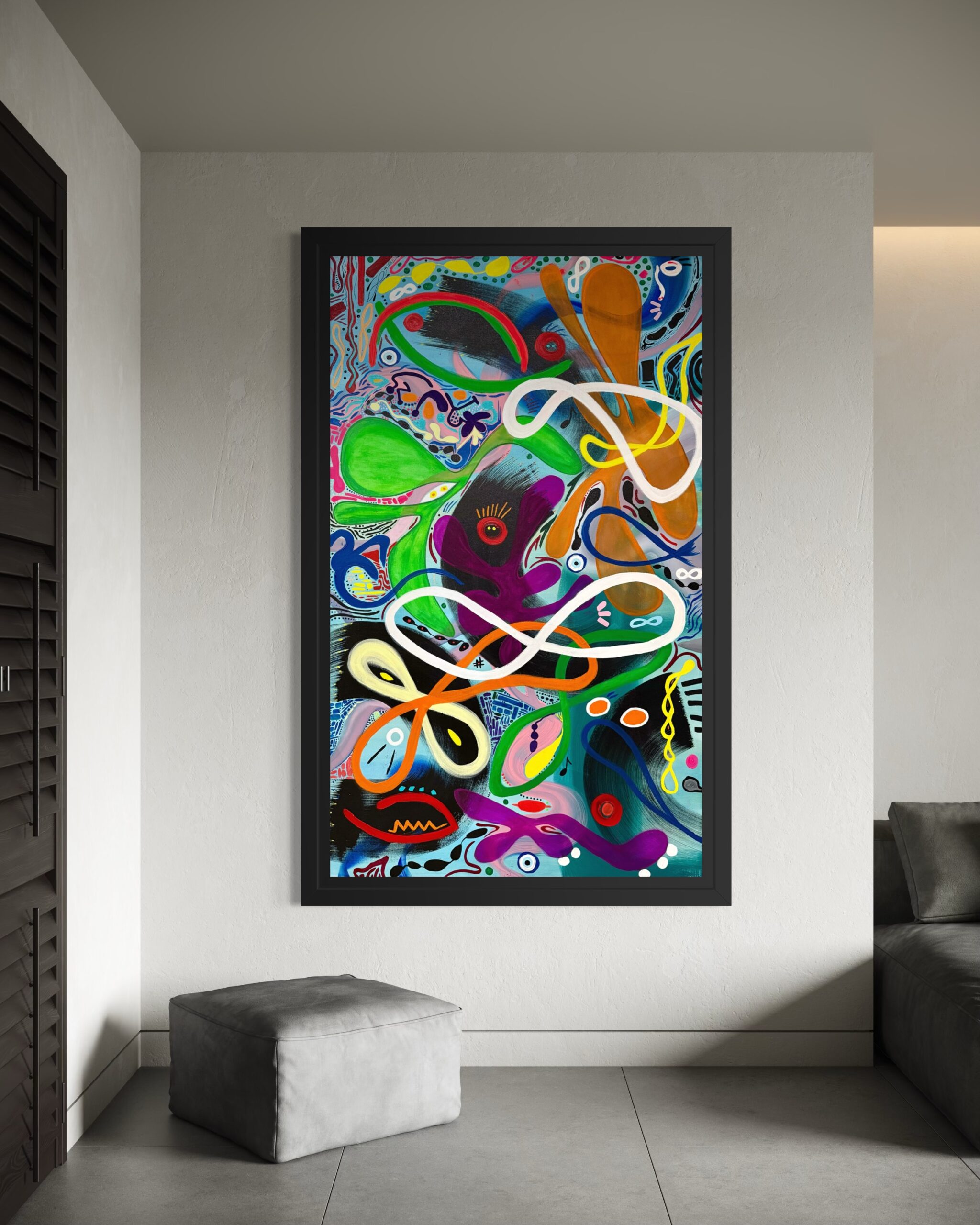 Through a kaleidoscope of abstract forms, fluid lines, and watchful eyes, the piece evokes the multiplicity of human awareness. It asks each viewer to pause, to interpret, and to connect – not only with the imagery but with their own inner vision.