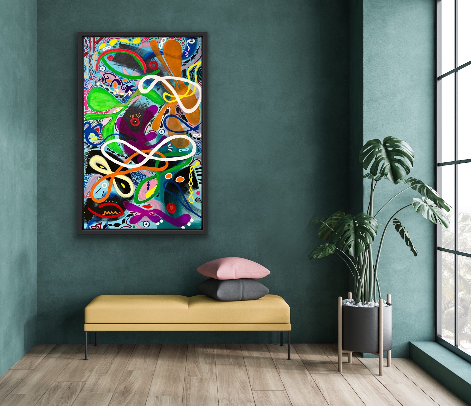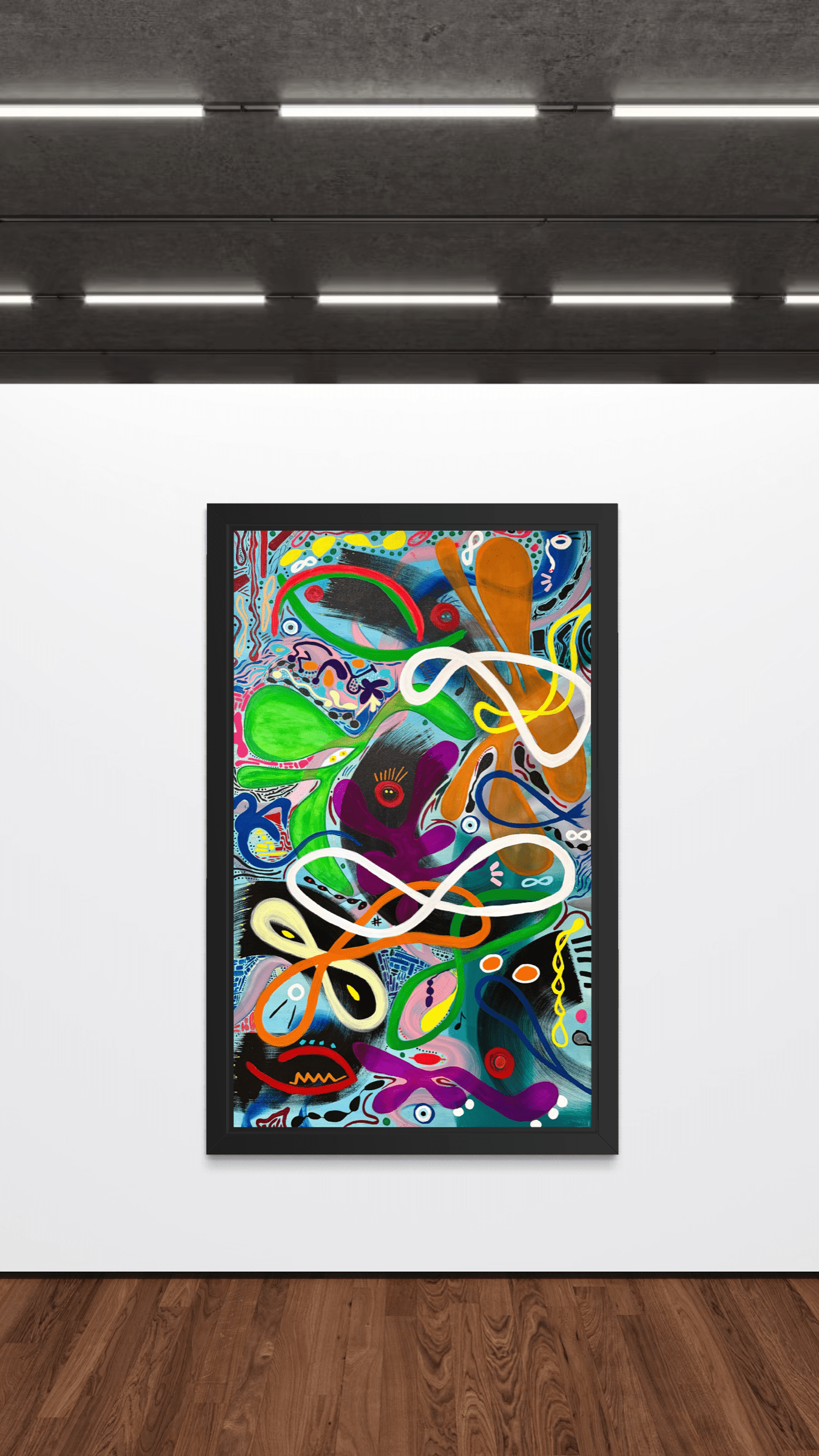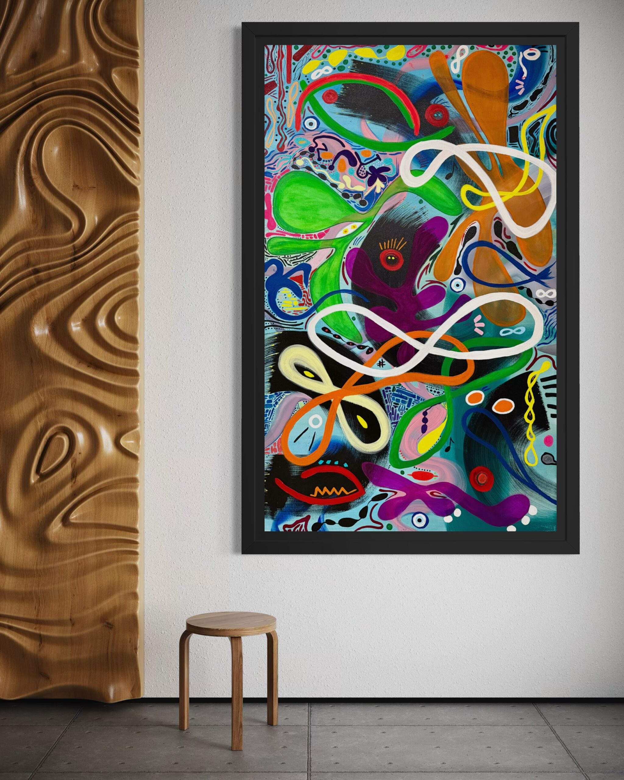 Through a kaleidoscope of abstract forms, fluid lines, and watchful eyes, the piece evokes the multiplicity of human awareness. It asks each viewer to pause, to interpret, and to connect – not only with the imagery but with their own inner vision.