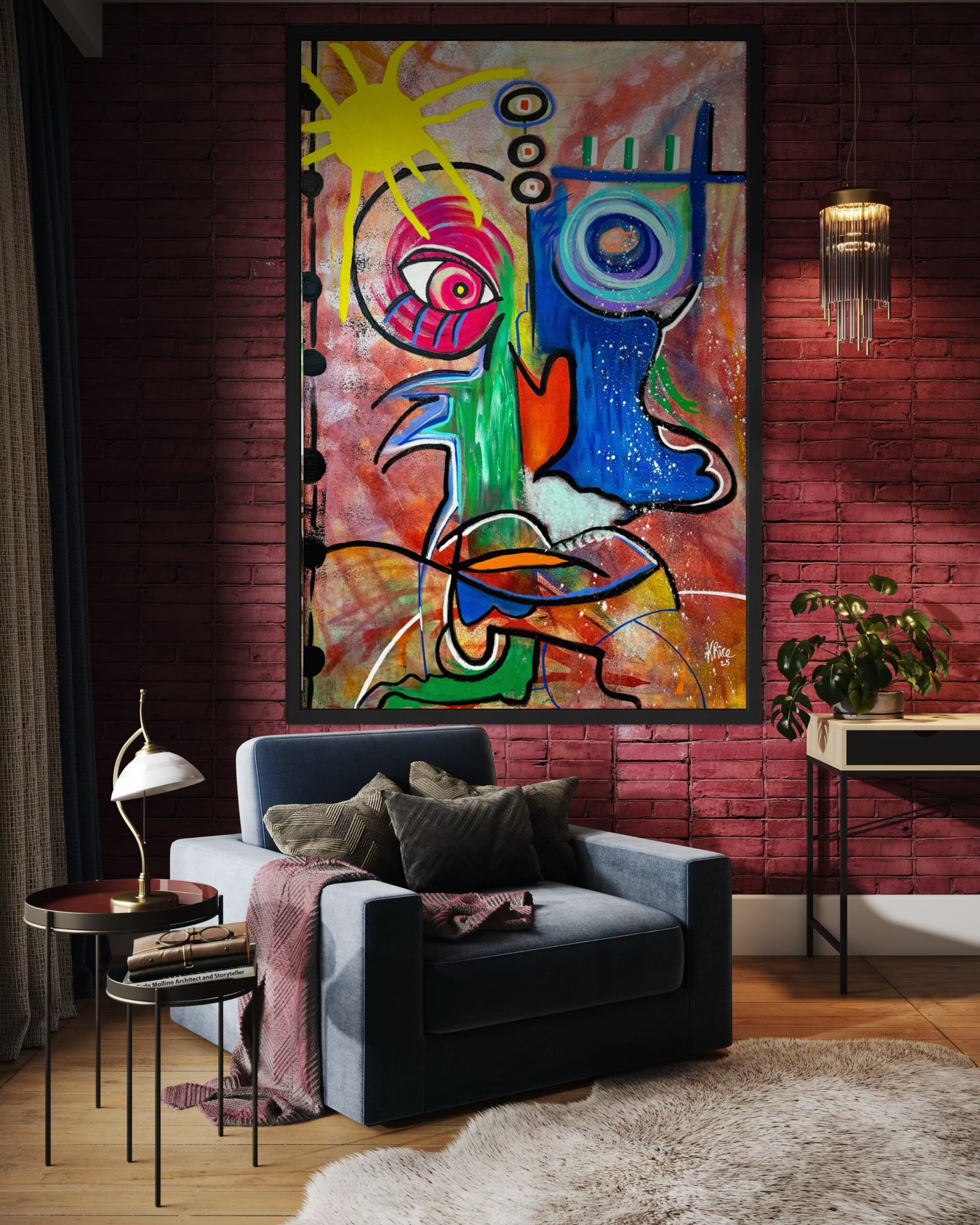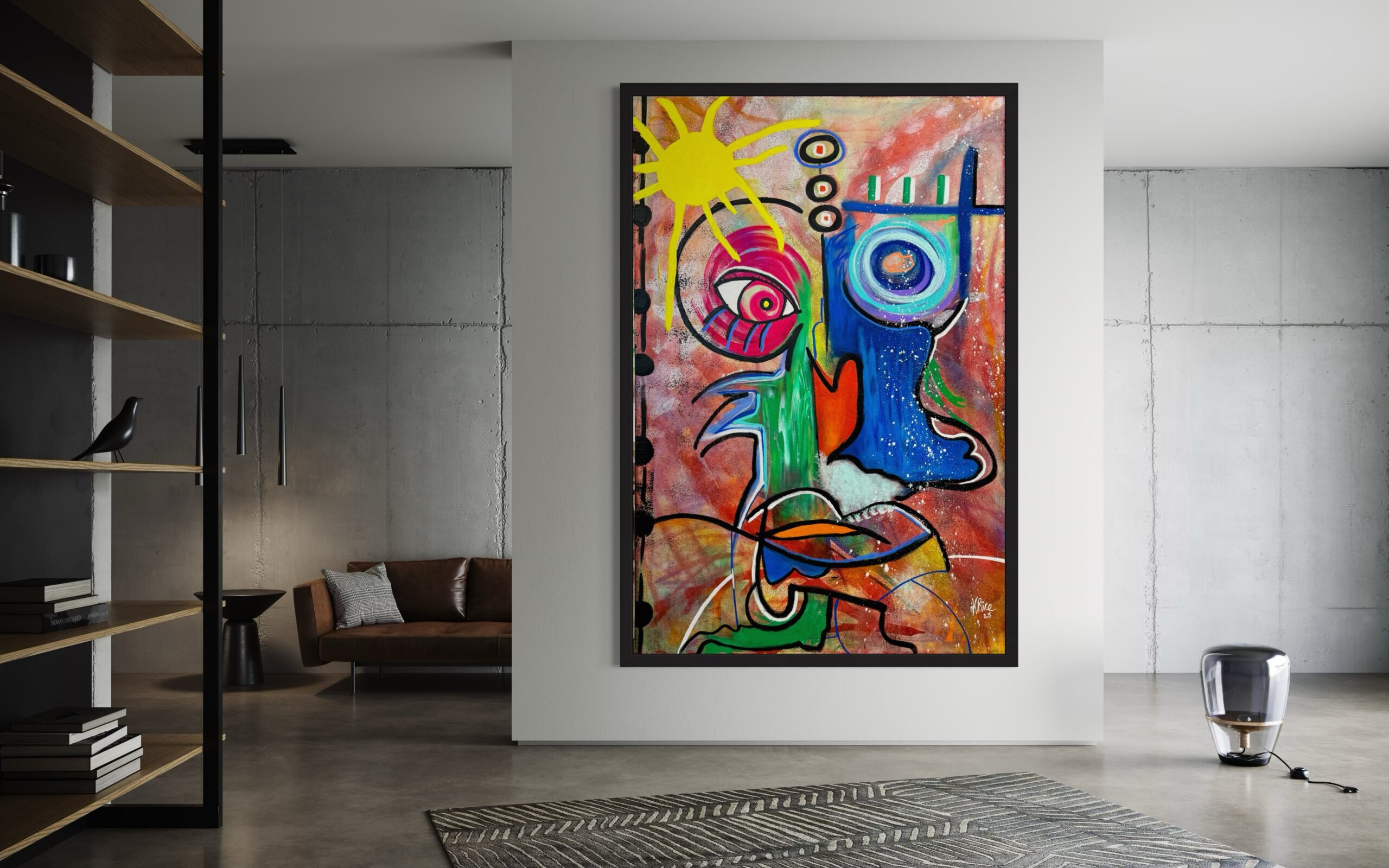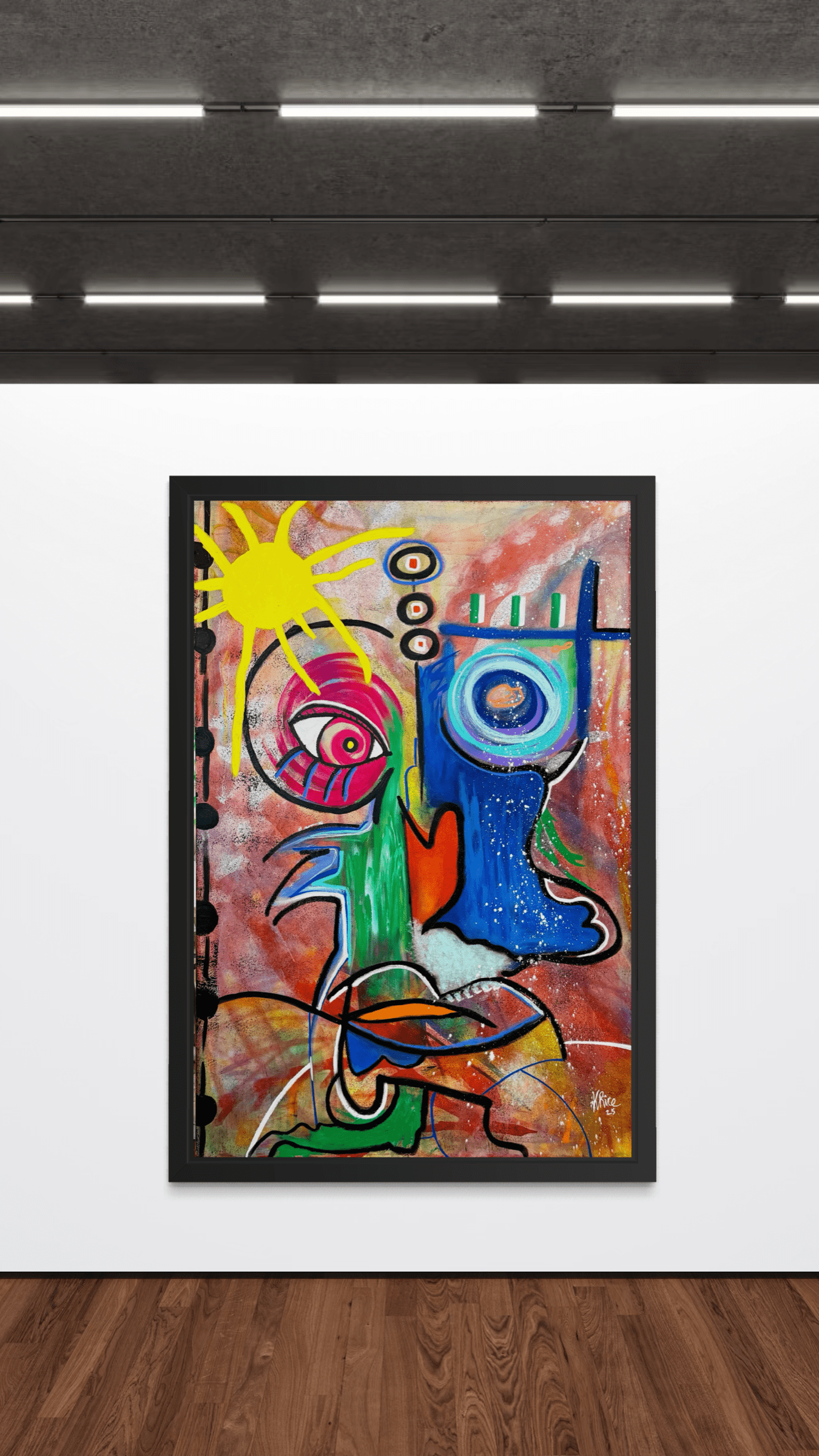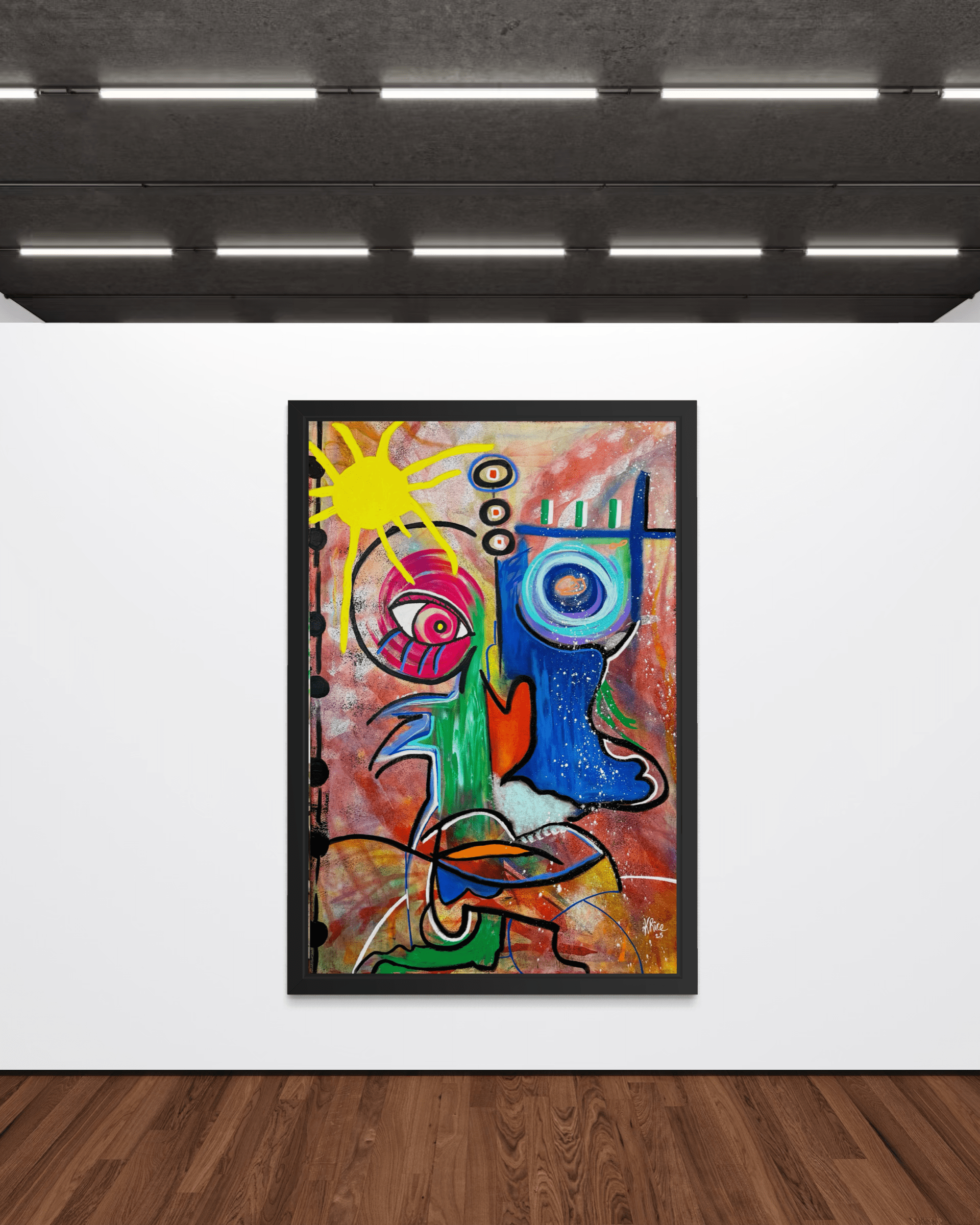 High Frequency radiates with the powerful aura of energy that transcends words. Anchored by the brilliance of a glowing sun and vibrant color fields, this work channels vitality, positivity, and the unseen vibrations that move through both people and the world around us. It is an exploration of resonance – the natural force that can be felt but not always seen – reminding us that frequency