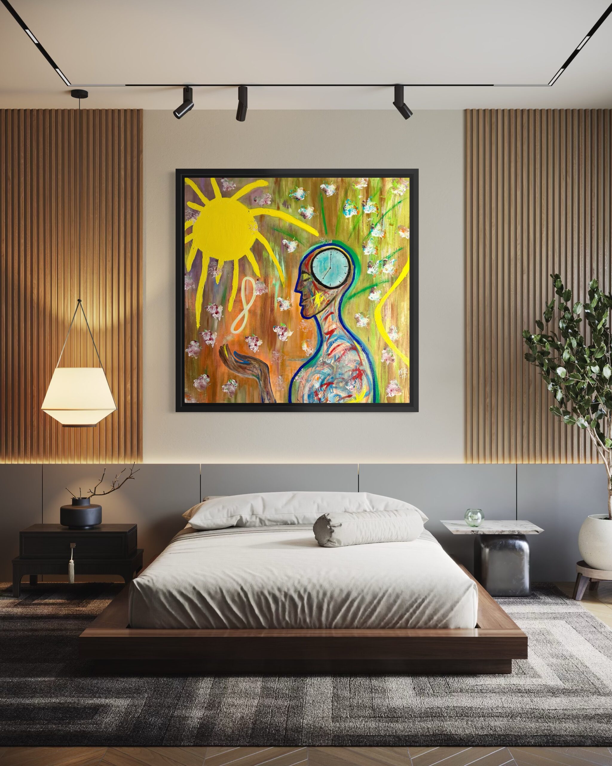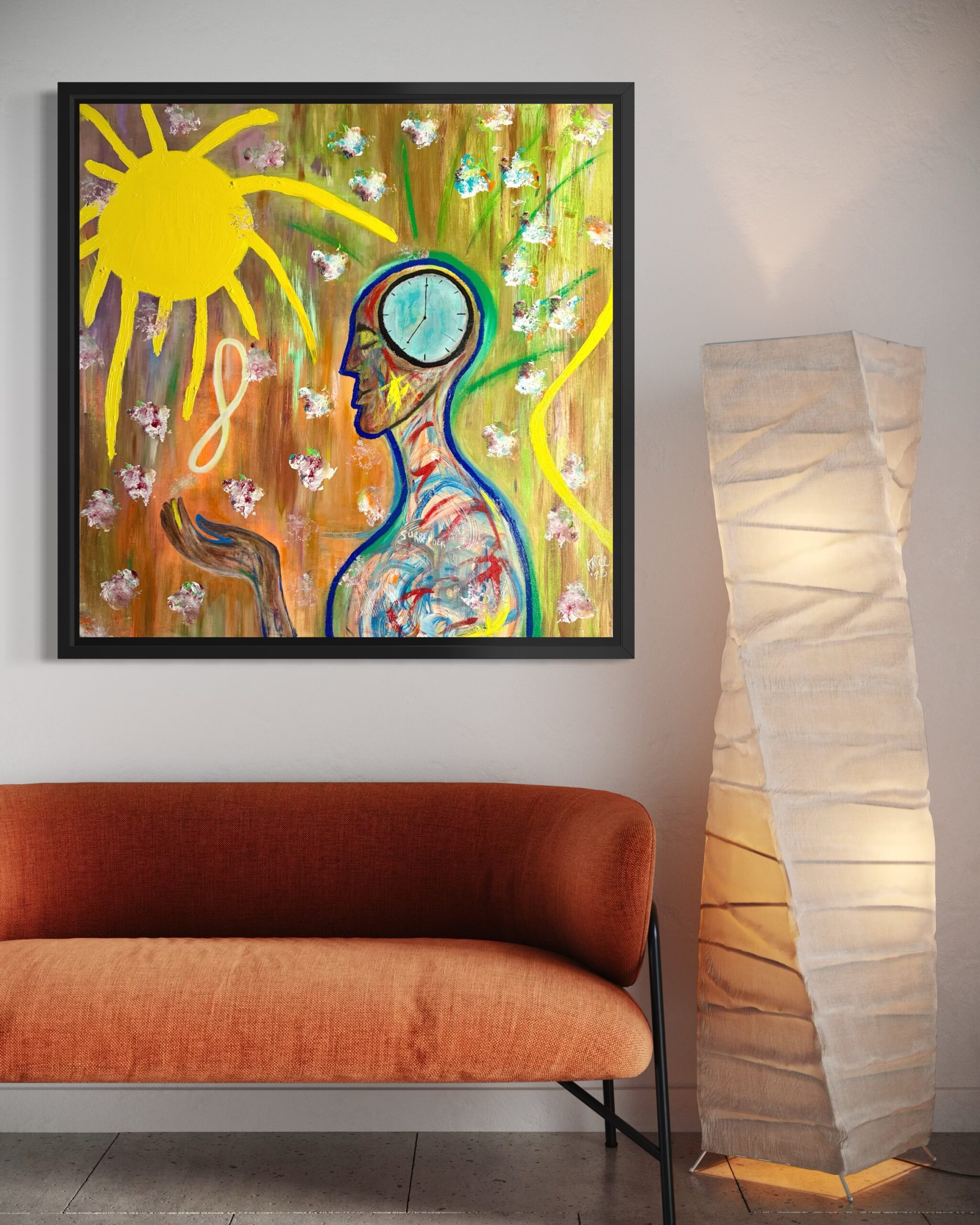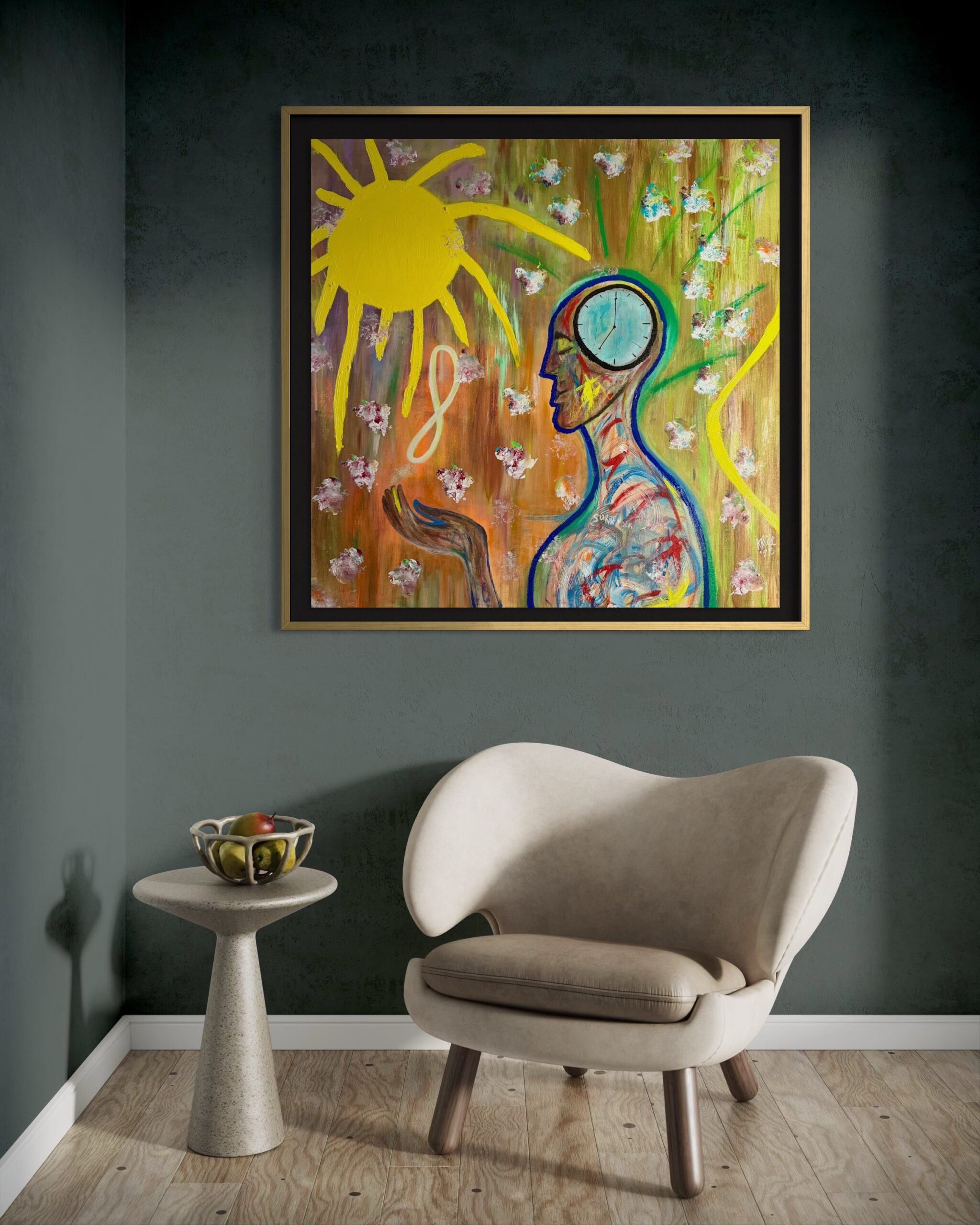 The central figure4marked with pathways of color and a clock embedded within the mind4represents consciousness in motion: the awareness that time, choice, and energy are inseparable. Surrounding blossoms drift across the canvas like moments, decisions, or seeds cast into the universe. The radiant sun and infinity motif echo the perpetual reciprocity that governs both spiritual and human experience.