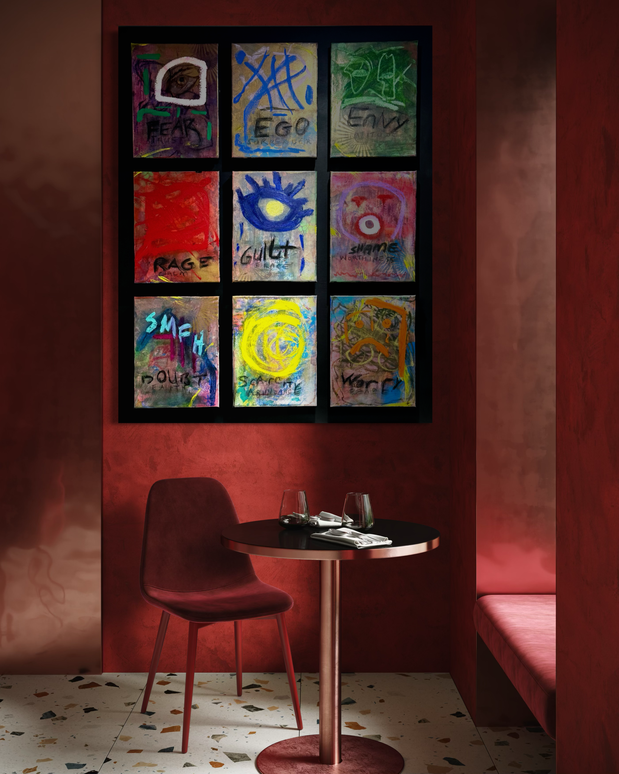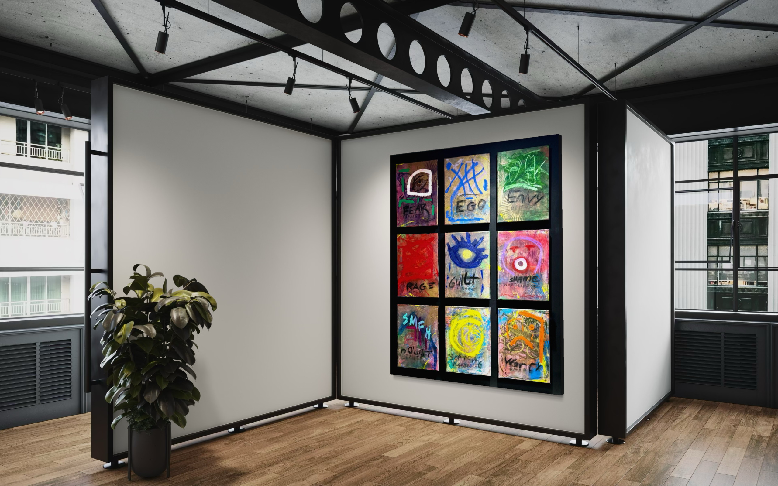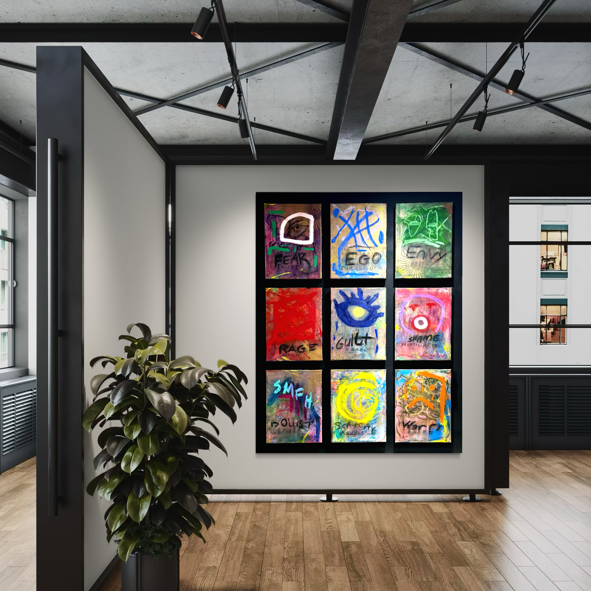 This work is a nine-panel exploration of emotional triggers, reactions and consequences: fear, ego, envy, rage, guilt, shame, doubt, scarcity, and lack of peace. Each panel represents a psychological interruption, a familiar internal surge that seeks immediate expression.