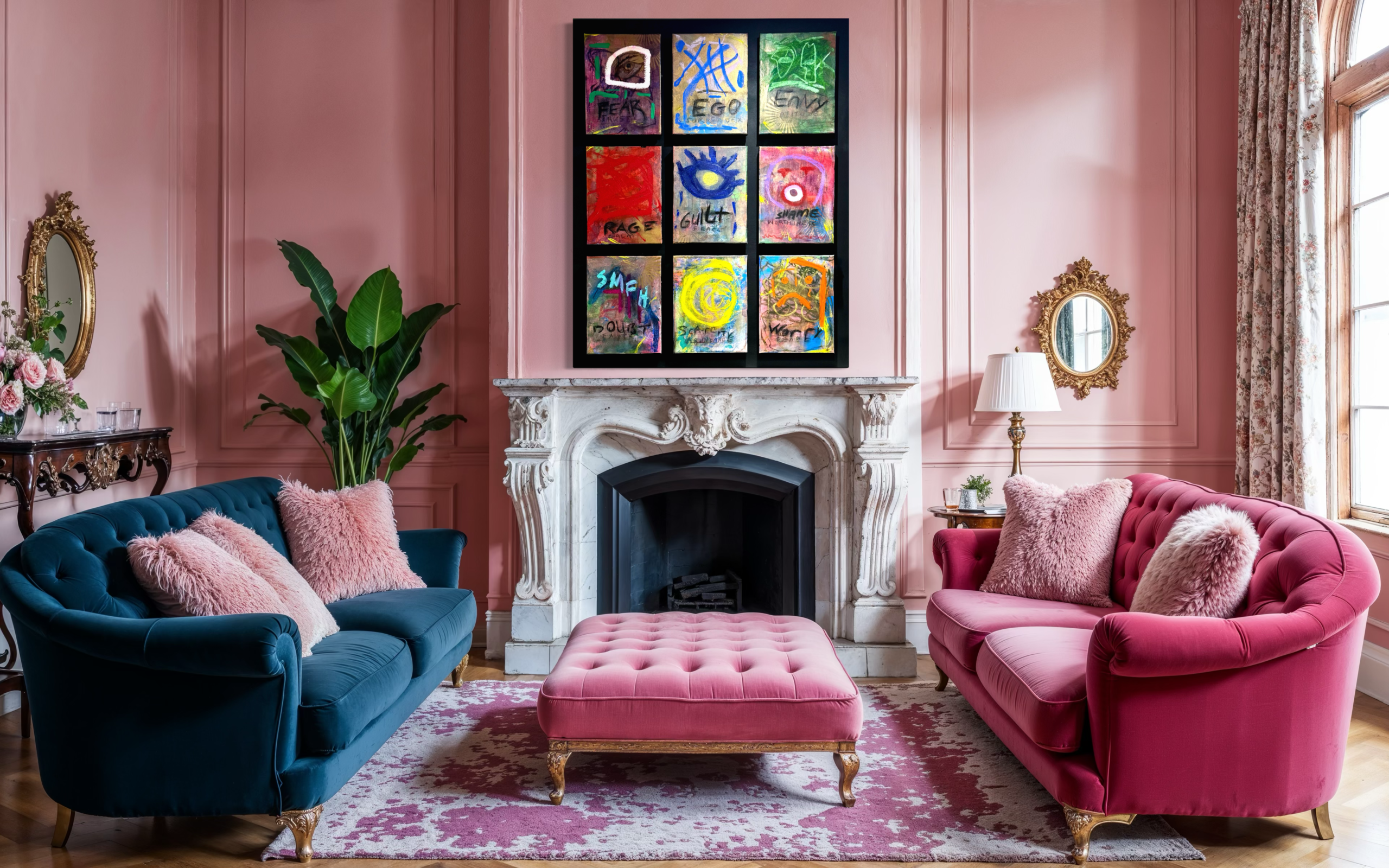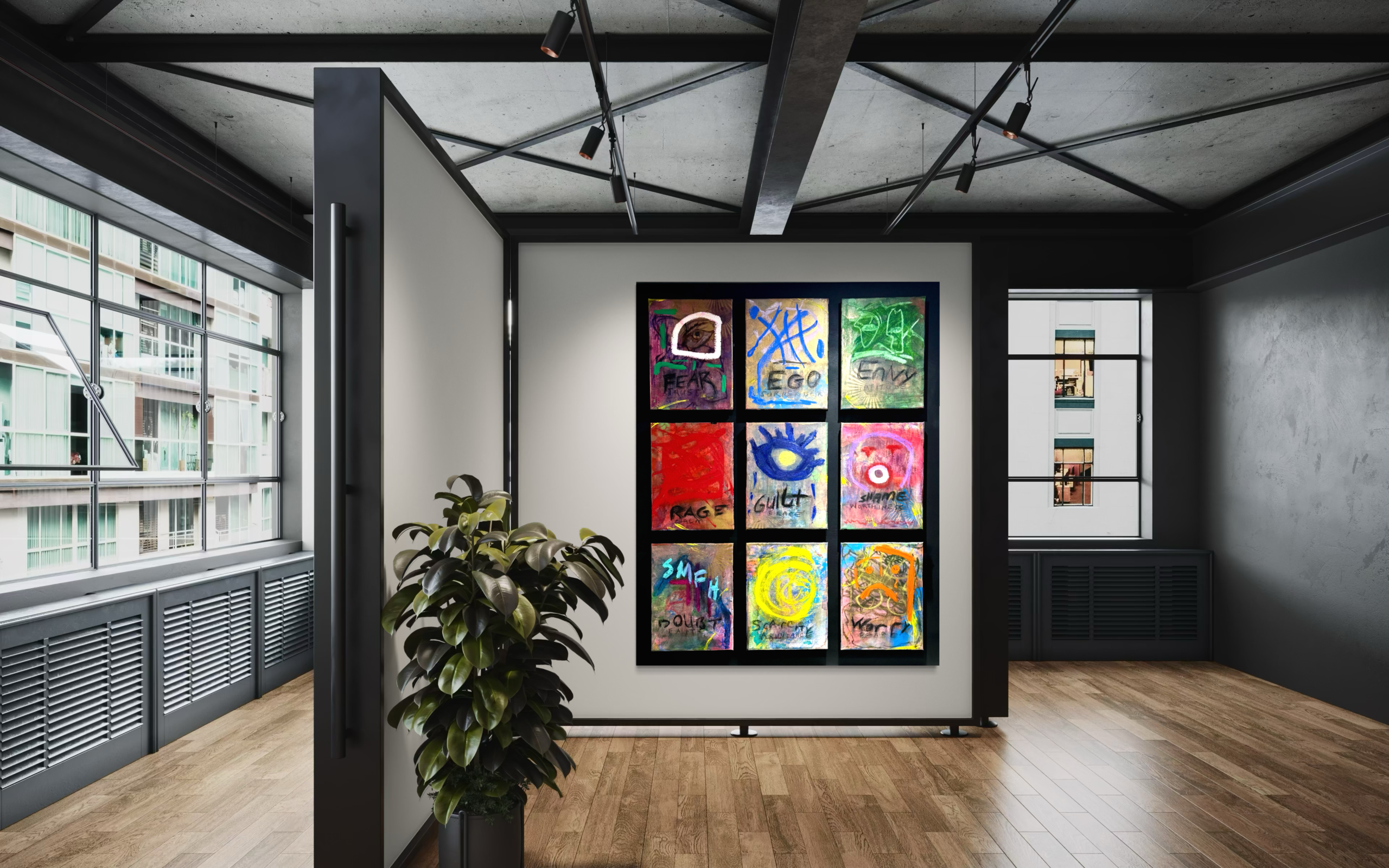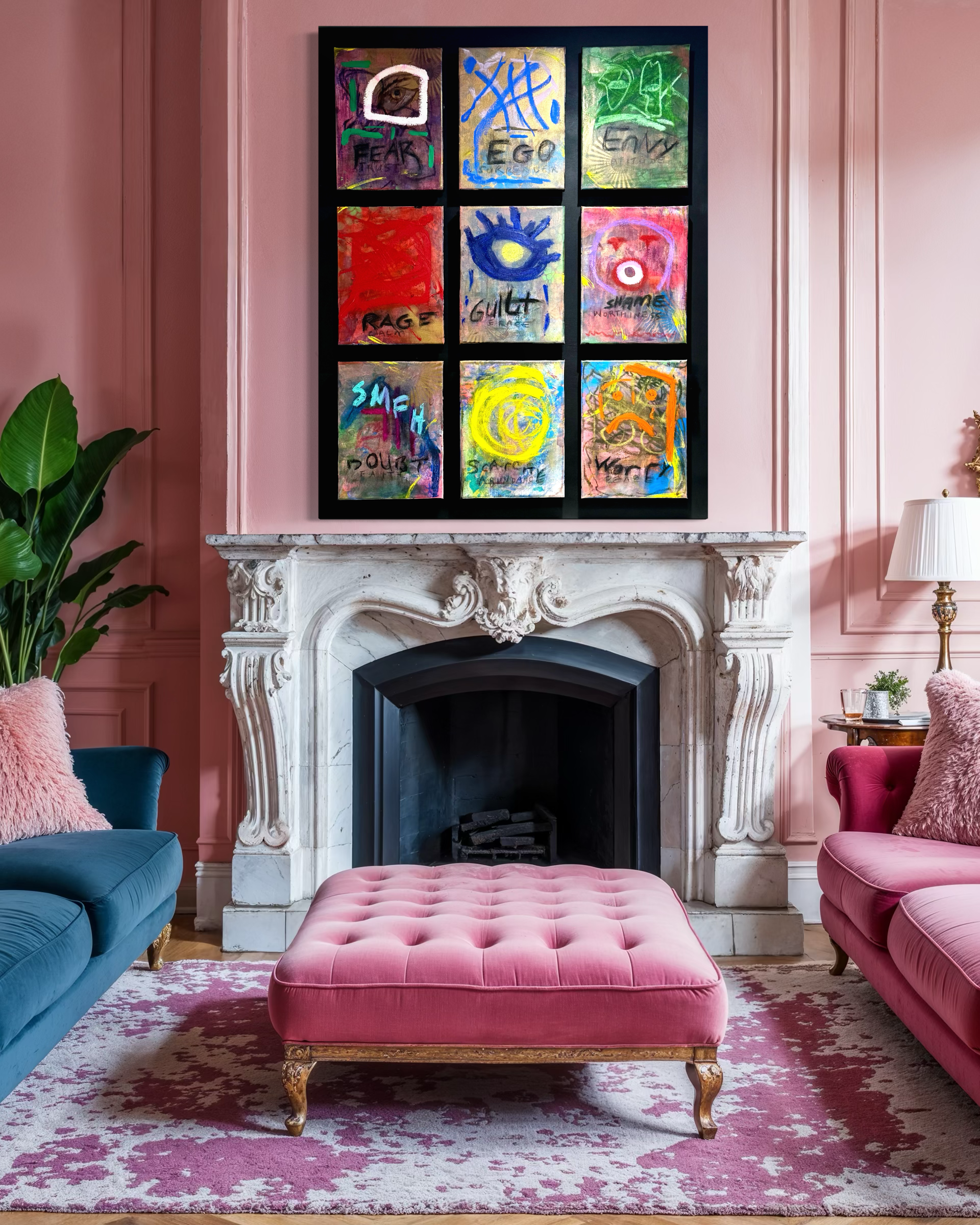 This work is a nine-panel exploration of emotional triggers, reactions and consequences: fear, ego, envy, rage, guilt, shame, doubt, scarcity, and lack of peace. Each panel represents a psychological interruption, a familiar internal surge that seeks immediate expression.